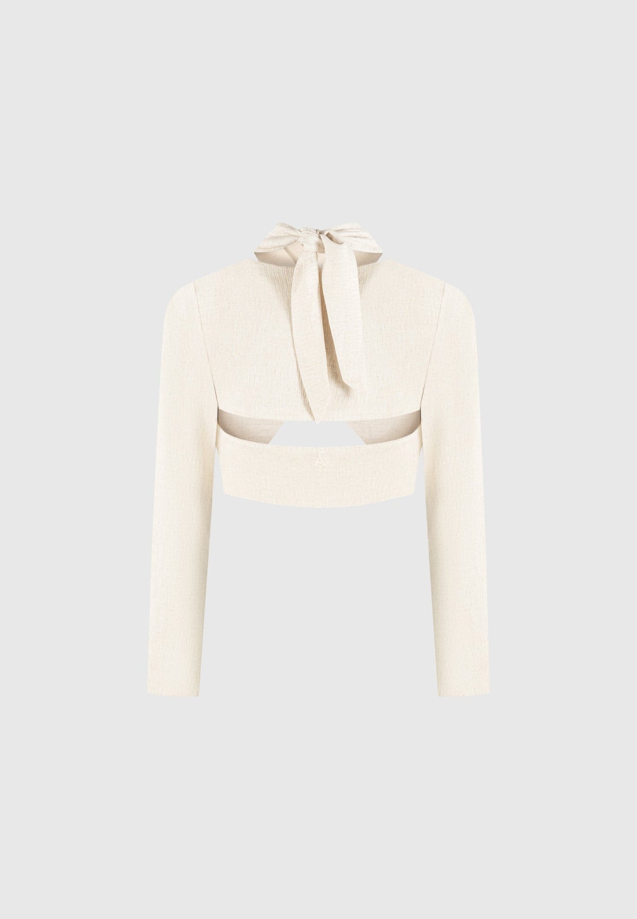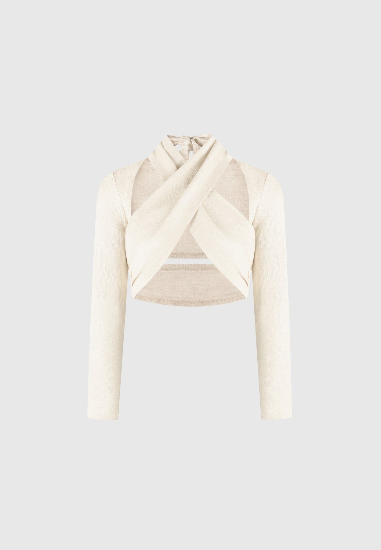 This natural linen bolero top combines the classic halter neck style with a modern, on trend sleeve overlay. Perfect for any occasion, this top is both stylish and comfortable with its soft, breathable fabric. Elevate your wardrobe with this essential piece.