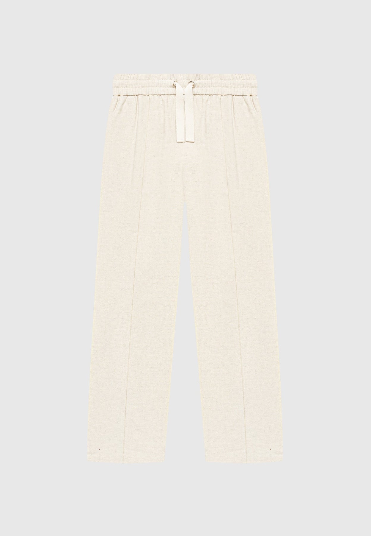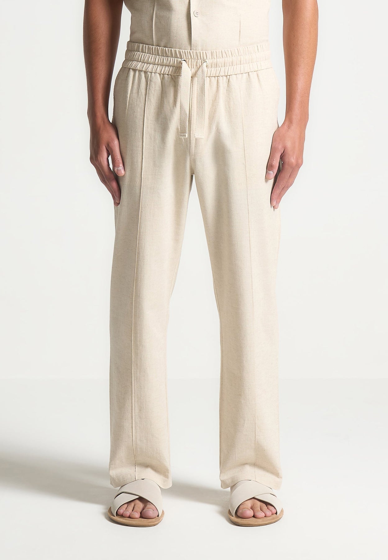 These Beige Pintuck Linen Trousers are meticulously tailored from breathable fabric, providing a comfortable and versatile option suitable for any occasion. The subtle pintuck detailing elevates the aesthetic, while the regular fit guarantees a flattering silhouette.