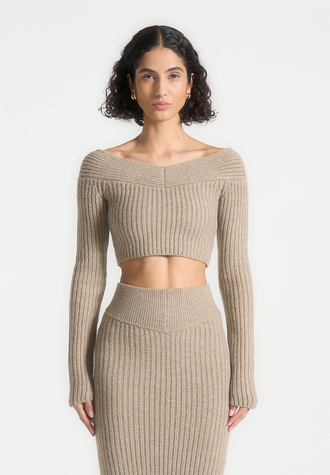 Off Shoulder Knit Crop Top - Beige Marl