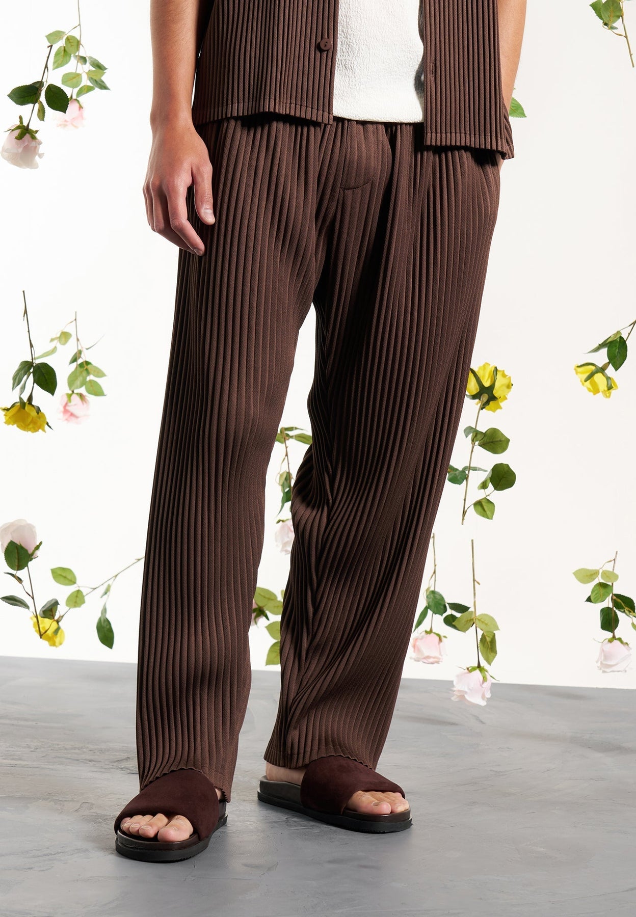 Expertly crafted with breathable fabric, these Brown Pleated Trousers offer both style and comfort. The relaxed fit is perfect for all-day wear, while the elasticated waistband ensures a comfortable and secure fit. Experience the perfect combination of fashion and functionality with these trousers.