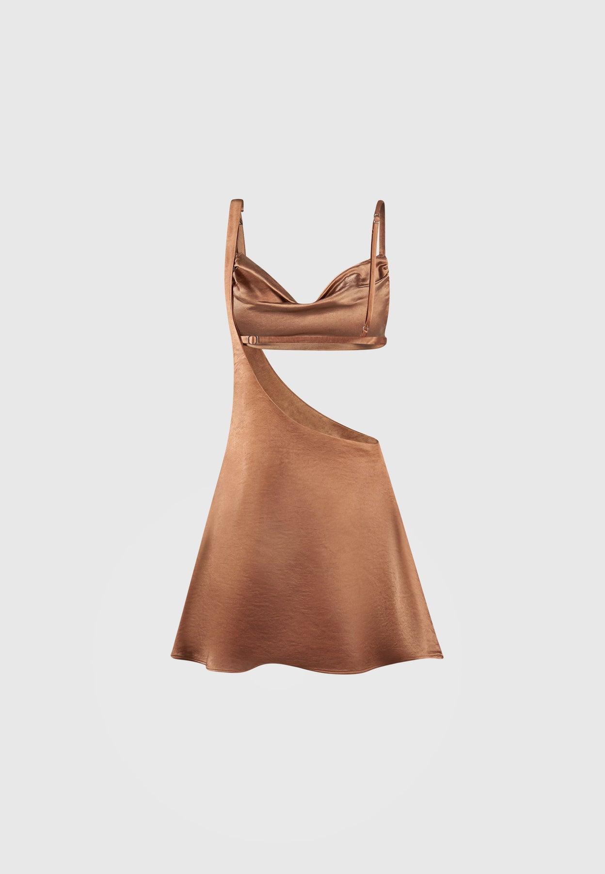 Make a statement in this Satin Bralette Fluted Mini Dress. The drape front bralette and curved waistline give a flattering fit, while the skirt and adjustable straps offer movement and comfort. Perfect for a night out or special occasion, this dress will have you feeling confident and feminine.