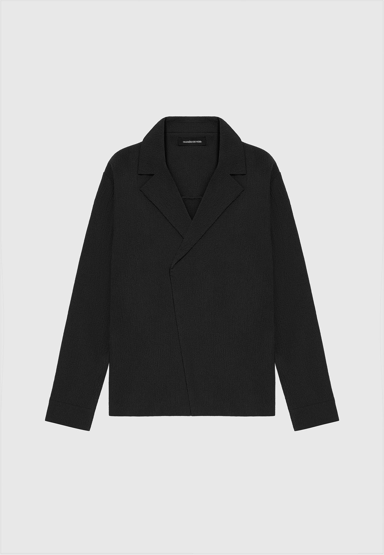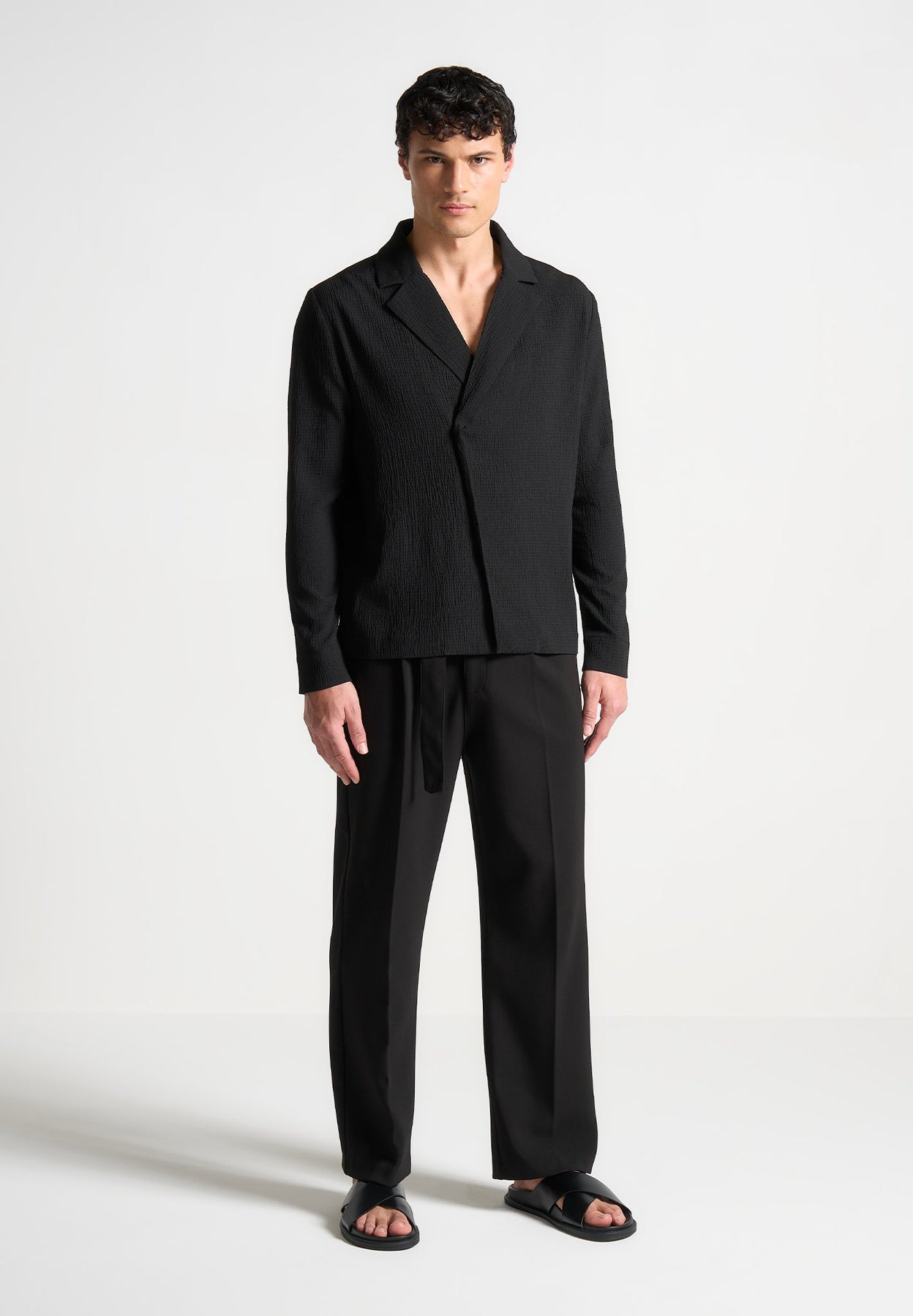 Introducing our Seersucker Double Breasted Shirt in Black. This long-sleeve silhouette presents a regular fit with a relaxed, open collar to ensure comfortable wear. With a secure internal button fastening and deluxe, textured fabric, this shirt seamlessly marries style with practicality.